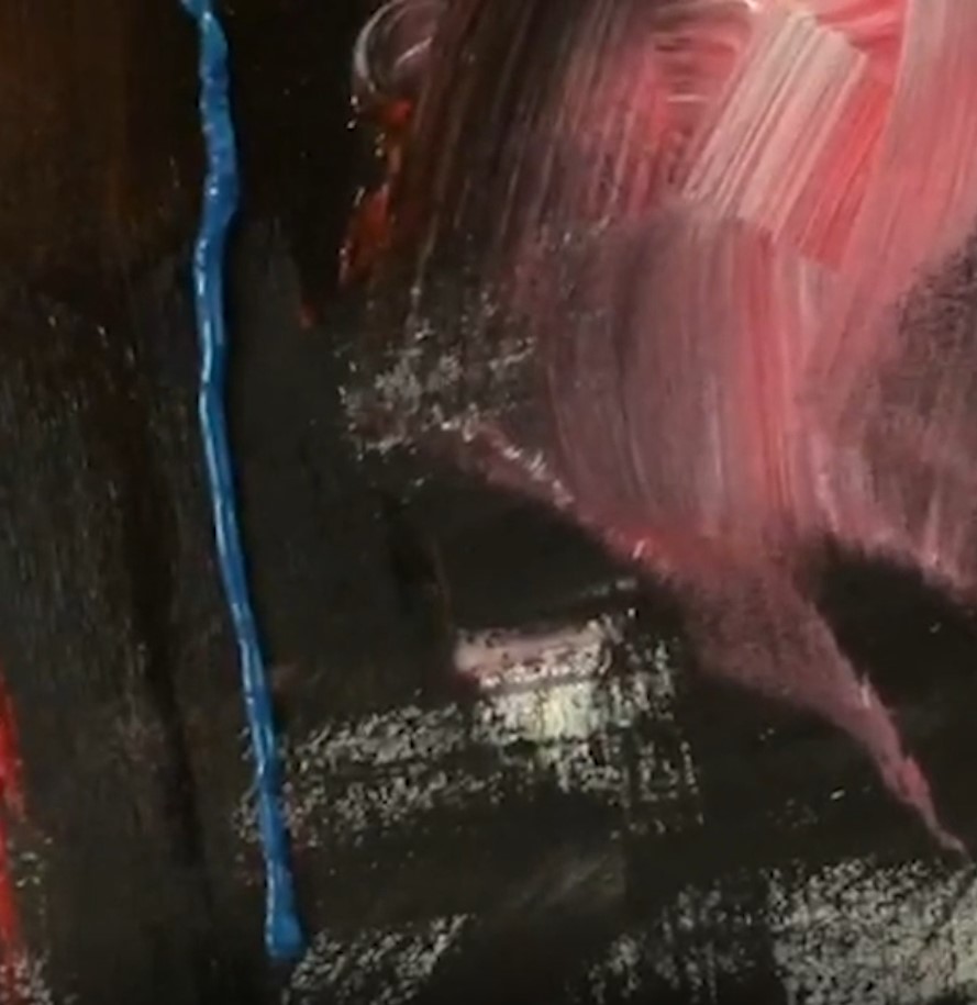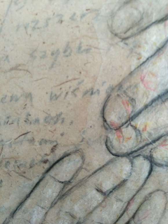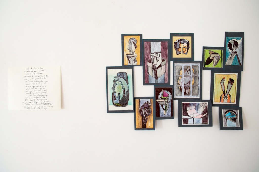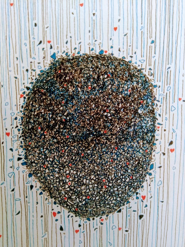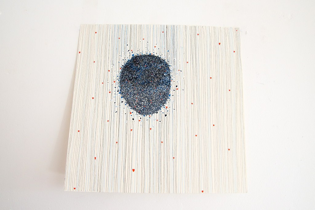 … I often work for years on a drawing, so that on/in a drawing are different steps of my artistic development and many, many layers one can sometimes see and sometimes not. the first layer of the drawing which is exhibited in your gallery was made in 2013. it was a self-portrait. i was sitting in my studio and was asking myself how my face does look like. so i went to the toilet and looked at myself in the mirror. then i ran back to the studio and tried to draw myself with a pencil and a rubber…. finally the drawing looked like a ghost or a cloud. .in 2016 i started to draw with ink. i took „old“ drawings and tried to catch all traces of the drawing by surrounding them. i felt like a scanner or archologist who scans all information of the drawing. that’s how the blue and black face/form in the middle was made.when this covid19 thing started this year, we all became possible virus-slingshots. so i started to draw small parts around the face, like small viruses which get flinged in the space. i did a small serie of drawings who are named virus-slingshots in the last few months. it is a bad theme and a bad time but i really like the drawings. the are somehow sweet and friendly. i think that is the reason why i draw hearts and lines and choose the title virus-slingshot in love. another reason is that in serious art „hearts“ are forbidden! that is why i sometimes draw hearts and little stars …. in my very very serious drawings. yours, kathrin