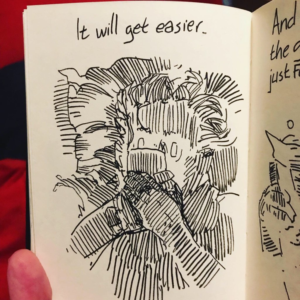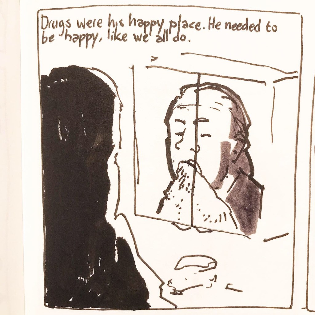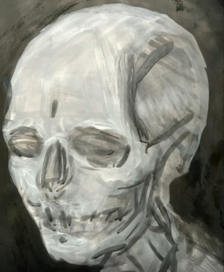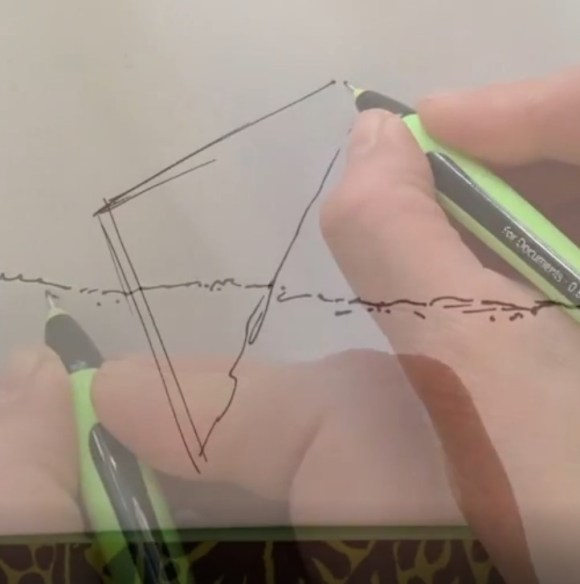 … I often work for years on a drawing, so that on/in a drawing are different steps of my artistic development and many, many layers one can sometimes see and sometimes not. the first layer of the drawing which is exhibited in your gallery was made in 2013. it was a self-portrait. i was sitting in my studio and was asking myself how my face does look like. so i went to the toilet and looked at myself in the mirror. then i ran back to the studio and tried to draw myself with a pencil and a rubber…. finally the drawing looked like a ghost or a cloud. .in 2016 i started to draw with ink. i took „old“ drawings and tried to catch all traces of the drawing by surrounding them. i felt like a scanner or archologist who scans all information of the drawing. that’s how the blue and black face/form in the middle was made.when this covid19 thing started this year, we all became possible virus-slingshots. so i started to draw small parts around the face, like small viruses which get flinged in the space. i did a small serie of drawings who are named virus-slingshots in the last few months. it is a bad theme and a bad time but i really like the drawings. the are somehow sweet and friendly. i think that is the reason why i draw hearts and lines and choose the title virus-slingshot in love. another reason is that in serious art „hearts“ are forbidden! that is why i sometimes draw hearts and little stars …. in my very very serious drawings. yours, kathrin