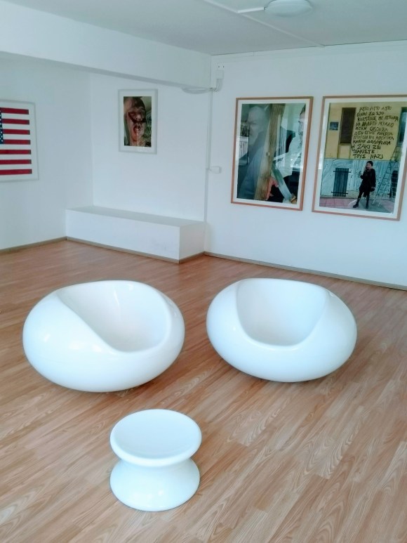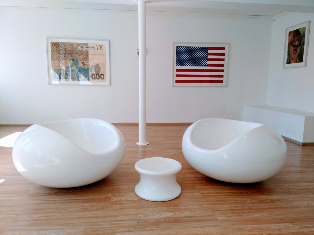 Galleriakalusteina ja loistavasti taiteen kanssa sopivina kaikissa näyttelyissä oli Eeron Aarnion suunnittelemat ikoniset Pastilli-tuolit ja Mushroom, sekä rottinkiset Juttujakkarat. Yhteistyössä Eero Aarnio Original, joka on ainoa Eero Aarnion klassikoiden alkuperäinen valmistaja ja joka toimii sekä valmistaa tuotteet Suomessa. Eero Aarnio s. 1932, suunnittelee uusia tuotteita edelleen ja on aktiivisesti mukana tuotekehityksessä.
