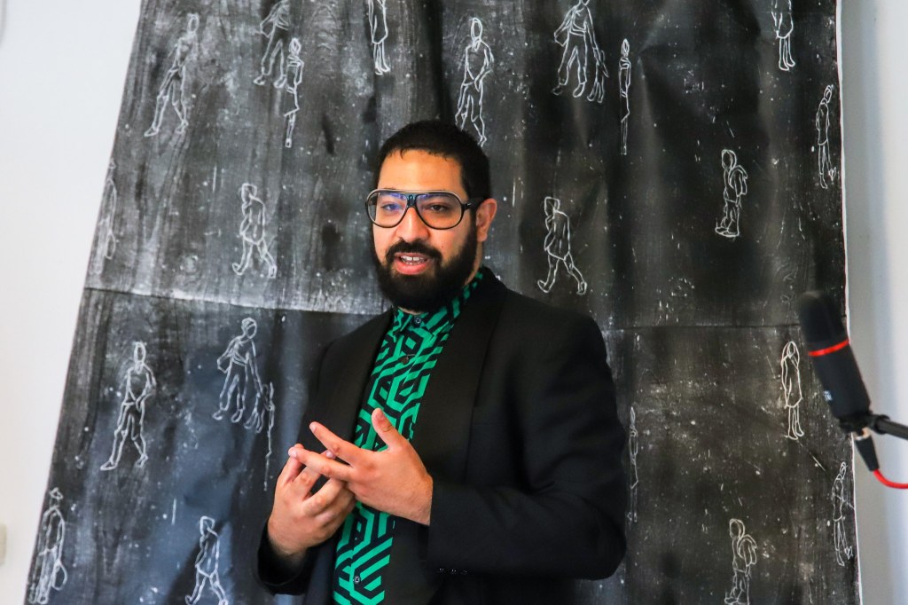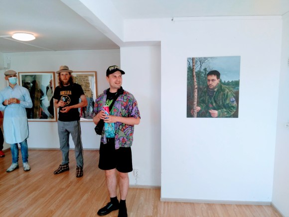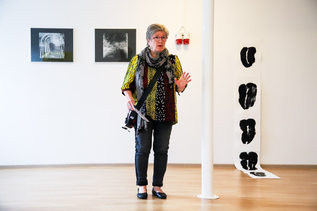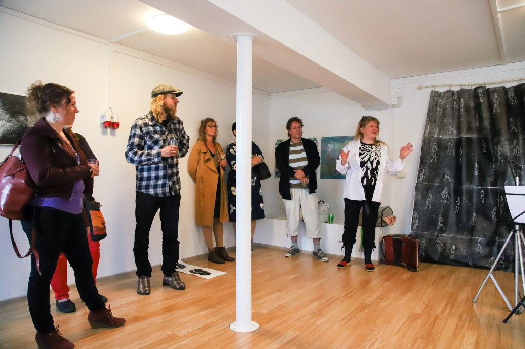 Eija Ahvo ”Maalattu kosketus” avajaisissa. Taustalla Seppo Renvallin valokuvia ja Lotta Eskon teos. Kuva Päivi FalckMohammed Moe Mustafa. Taustalla Outimaija Hakalan ”Luokse” puupiirros. Kuva Päivi FalckAtheer Soot / Matti Collan. Kuva Päivi Falck