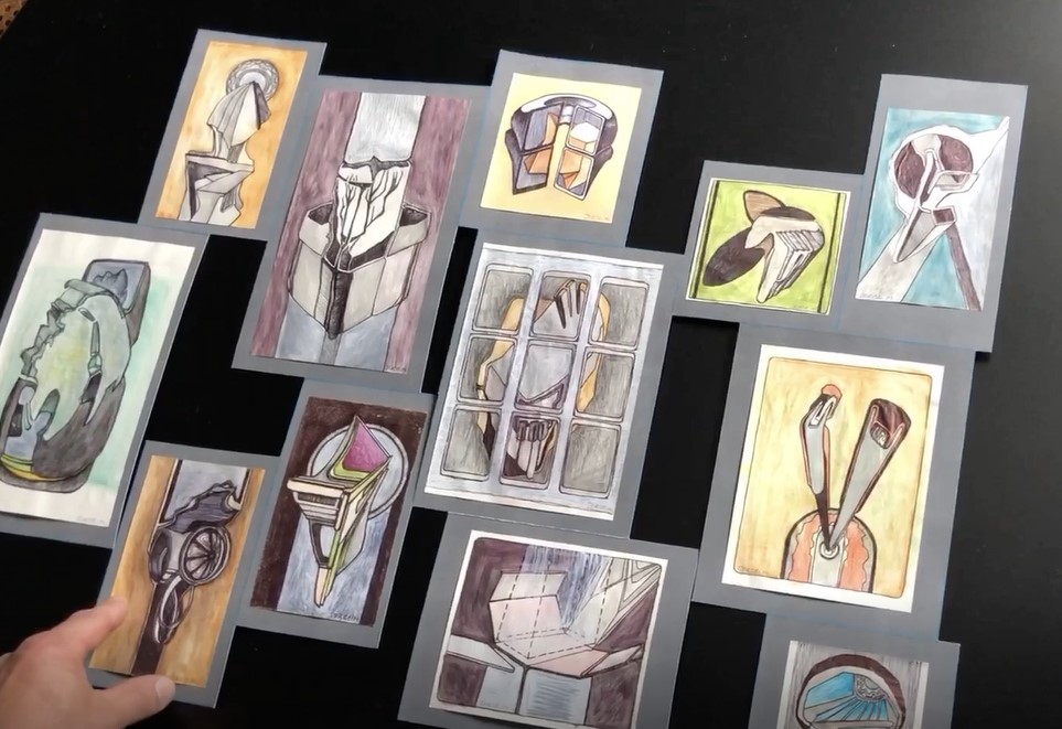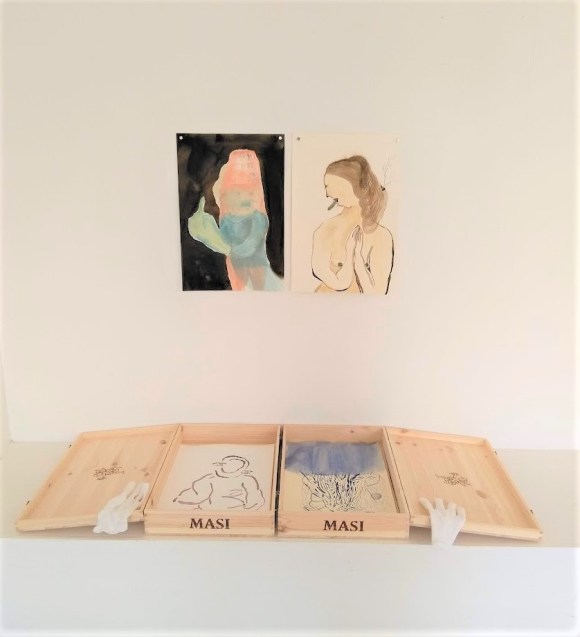 Maski-teos ja videostillit Gili AvissarMaria-Leena Räihälä, piirustukset ja taiteilijakirja