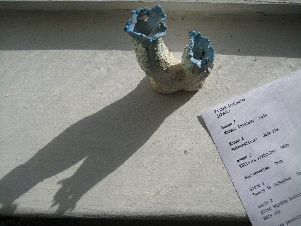 HU! Vain neljä päivää aikaa tutustua Eero Aarnion ja Komugi Andon näyttelyyn. Teokset yhdessä ovat luoneet tarinoita ja kiinnostuneita kävijöitä on riittänyt. Nauruun purskahdukset, uudet tulkinnat ja huomiot ovat kuuluneet tilassa. Samassa näyttelyssä voi päästä hyvin monenlaisiin maailmoihin. Pysähtyä pienien alttareiden äärelle tai päästä materiaalien ja tuoksujen kautta menneeseen maailmaan. Kuunnella pieniä tarinoita Japanin mummon…