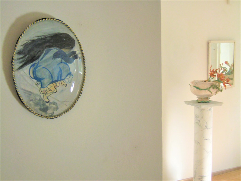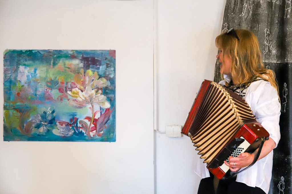 Maija Saksman ”Lauluja tauluille”. Vasemmalla Sirkku Katriina Ala-Harjan maalaus. Kuvat Päivi Falck